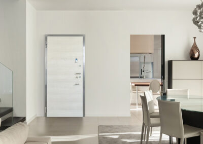 Grazie all’uso di materiali isolanti inseriti all’interno del pannello, come poliuretano espanso ad alta densità o lana minerale, le porte blindate garantiscono ottime prestazioni di isolamento termico e acustico, contribuendo all’efficienza energetica dell’abitazione. Le finiture esterne possono essere personalizzate in una vasta gamma di pannelli decorativi: legno massello, MDF laccato, alluminio, HPL o superfici antigraffio. Sono disponibili soluzioni coordinate con i portoncini condominiali o con le altre porte dell’edificio.